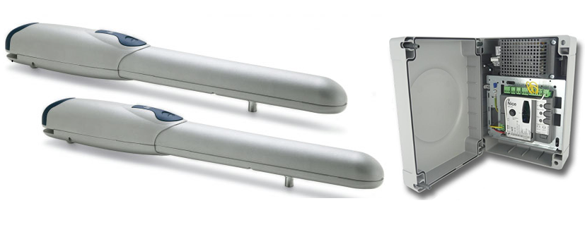 Привід для розпашних воріт Nice WINGO 4 KLT з шириною стулки до 2 м і масою до 400 кг Поставляється у наборі, який складається з: 2-ух приводів WG4000, блоку управління MC800, радіо радіо OXI і нового пульта FLO2RE. Крім цього, набір має можливість бути доповненим антеною, що підвищує радіус дії радіоприймача та пристроями безпеки: сигнальною лампою і фотоелементами. Привід Найс WG 4 KLT має в комплекті одну пару кінцевих вимикачів (механічні упори PLA 13), що дозволяє регулювати крайні точки відкриття стулок ваших воріт. При закриття стулок необхідно при монтажі зробити посередині отвору упор в землі, саме він і буде місцем зупинки воріт.